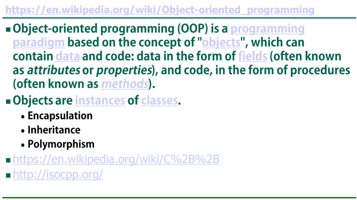 - "클래스"는 추상적인 개념으로서 특정 종류(혹은 유형)의 모든 가능한 속성과 동작을 나타내며, "객체"는 그 추상적인 개념에 대응하는 구체적인 실체화이다.