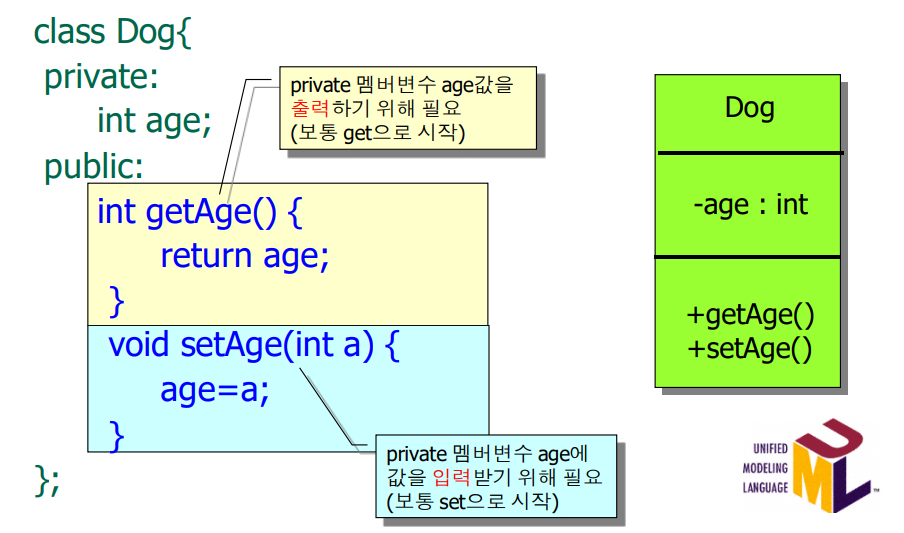 cout << happy.getAge(); // ③ age는 전용멤버로 접근 불가