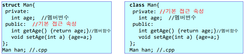 2. 접근제어 속성을 생략하면 struct은 public, class는 private이 기본이다.