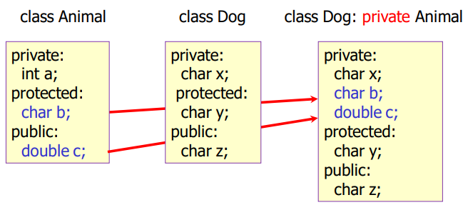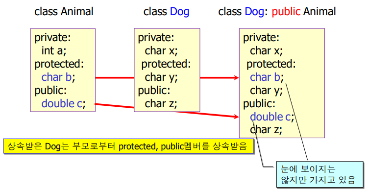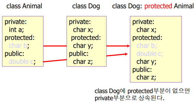 11. private 상속 접근한 경우(class Dog : private Animal) 기본 클래스의 모든 멤버가 파생 클래스의 private 멤버가 된다.