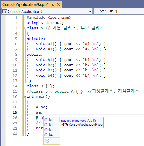 2. 14열에 있는 class B : public A { }; 는 class B가 A의 public부분을 상속받아 다 이용할 수 있다는 것이다.