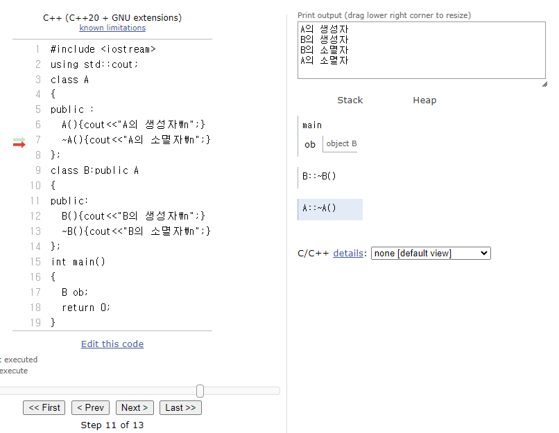 return 0; // 메인 함수 종료. 이 때 B의 소멸자와 A의 소멸자가 순서대로 호출됨