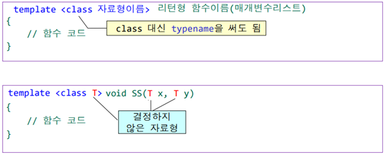 template <class T1, class T2> void fun(T1 x, T2 y) //class자리에 typename 작성 가능