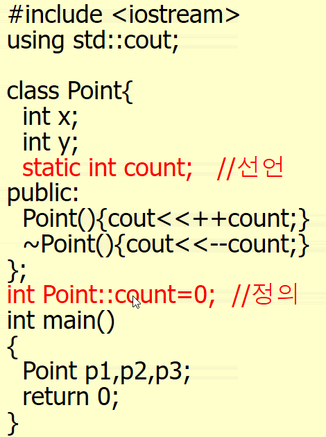- 스태틱멤버변수에는 선언만하면 됨 바깥쪽에서 정의라는 것 해줘야 함