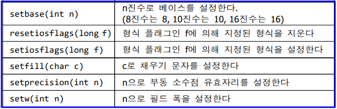 4. 형식 설정 멤버함수 : 출력 폭을 지정하거나 깔끔하게 출력하기 위해 사용, 빈칸을 채우는 멤버함수도 존재