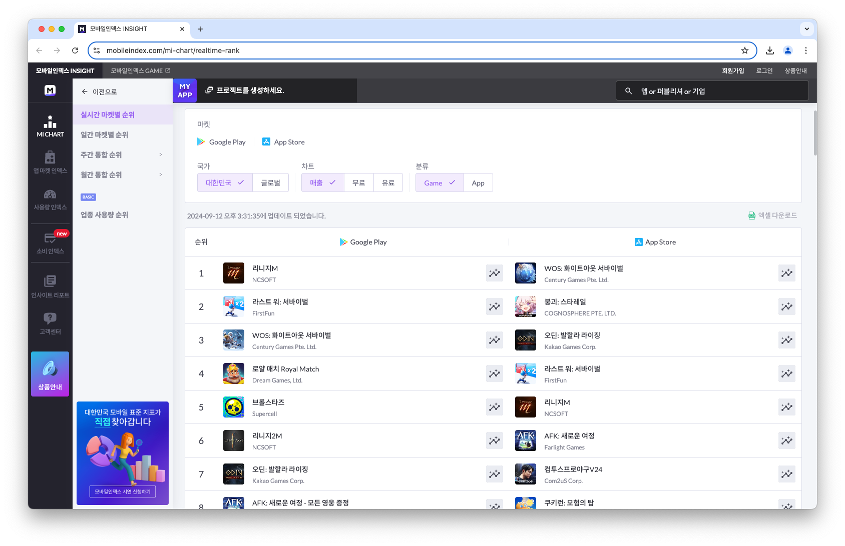 안드로이드와 애플 스토어의 인기앱 / 앱 순위를 볼 수 있는 페이지