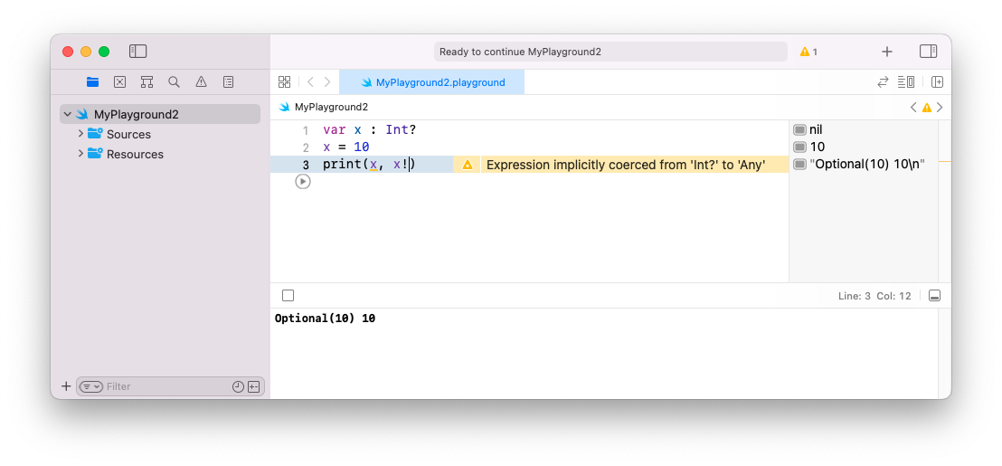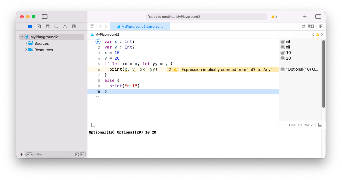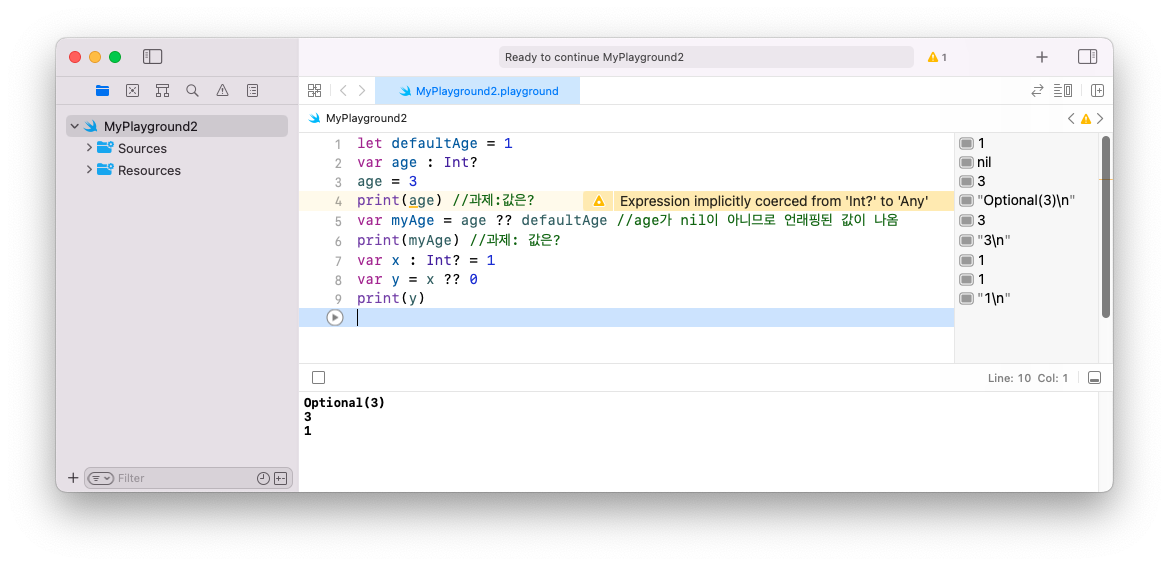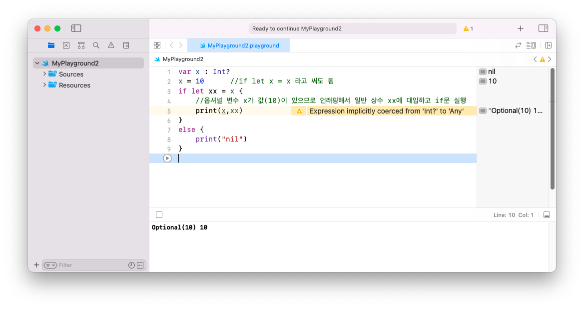 - 먼저 일반 옵셔널 값으로 사용하려고 하지만, optional로 사용할 수 없는 경우 Swift는 값을 자동으로 강제로 품