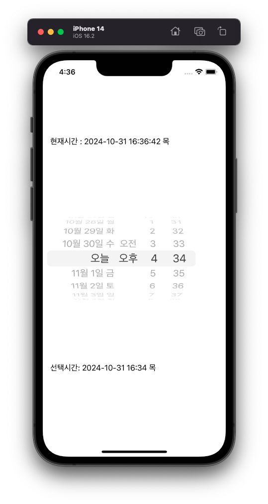 - 상단에는 현재 시간이 나오고, 하단에는 선택한 시간이 나오는 예제