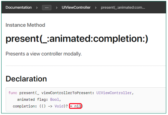 디폴트 인자(매개변수) - self.present(playerController, animated: true) player.play()