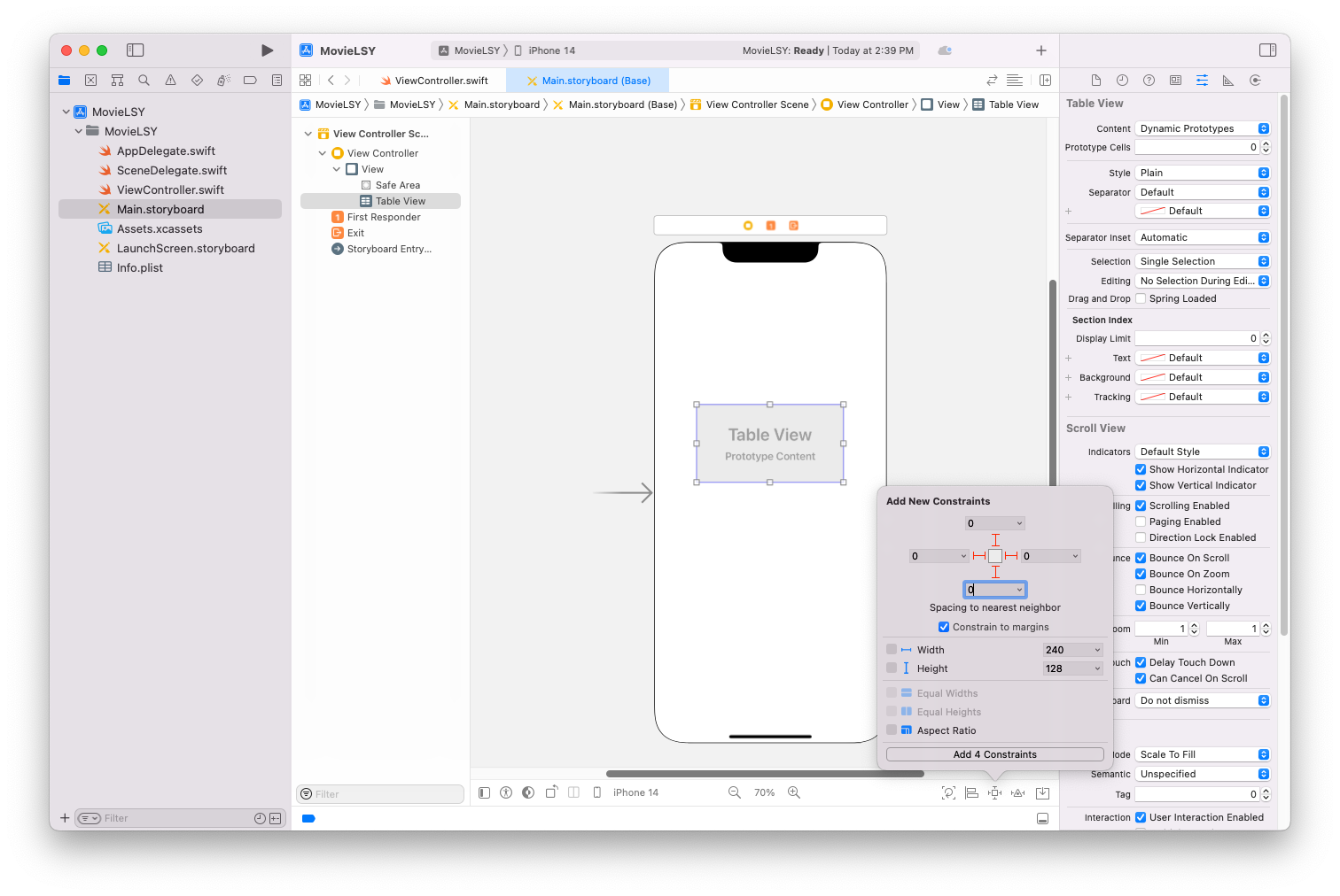 - 이 두 줄은 table이라는 테이블 뷰가 데이터를 어디서 가져올지(dataSource)와, 사용자 행동(예: 선택했을 때)을 누가 처리할지(delegate)를 이 클래스(self)가 맡겠다는 뜻입니다.