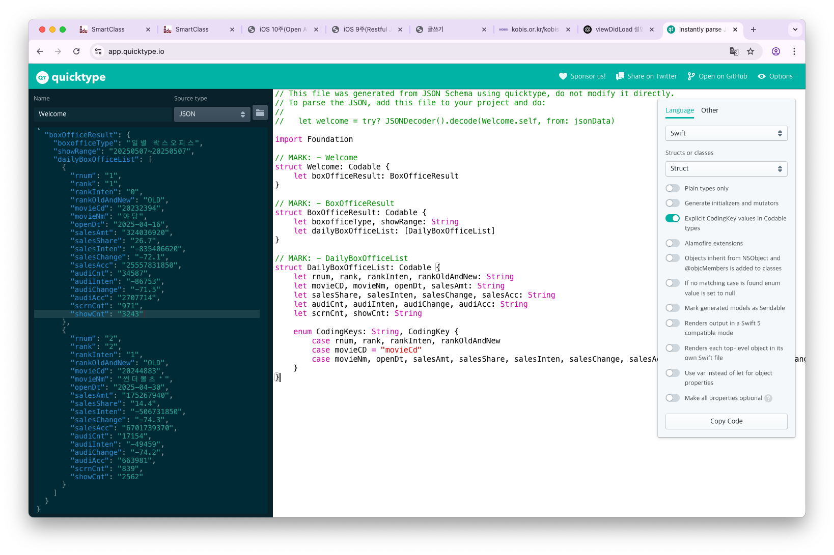 이 JSON 데이터를 쉽게 파싱할 수 있도록 Codable을 따르는 Swift 구조체(MovieData)를 만들어드릴게요.