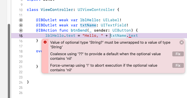 오류가 나는 이유 : "Hello, "는 string형이지만, 그 뒤의 txtName.text는 optional string형이기 때문에