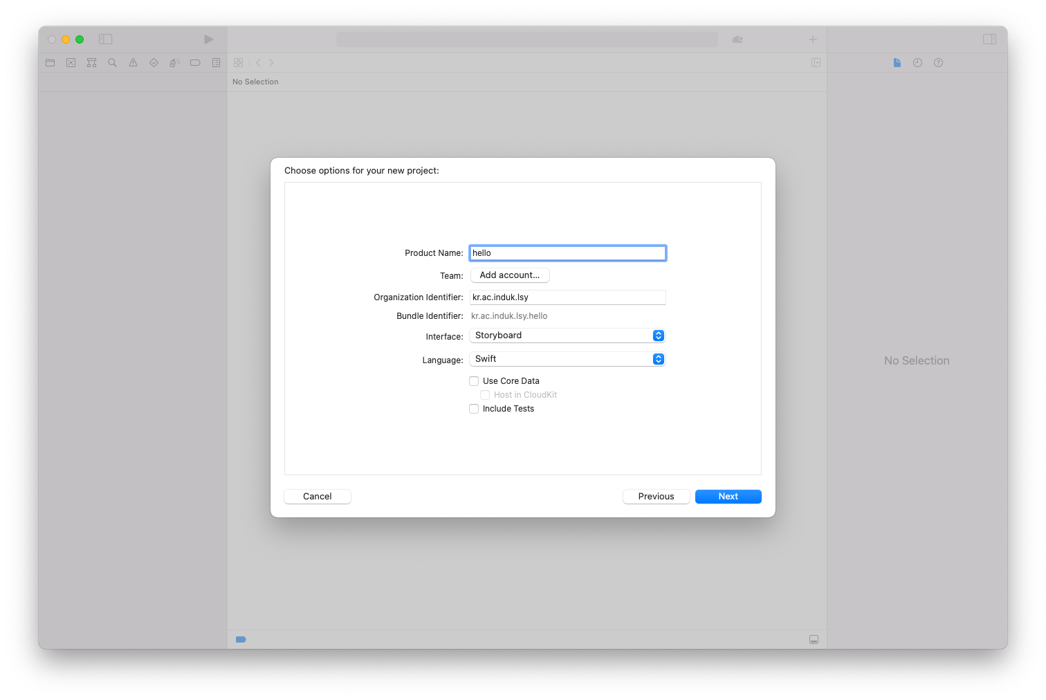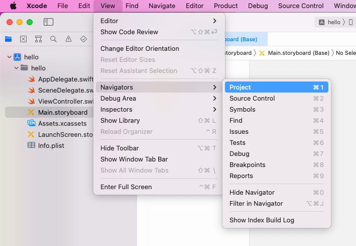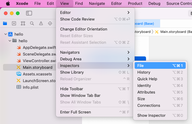 Assistant editor로 storyboard와 소스 연결 - Main.stroryboard 선택하고, ctrl+alt+command+enter