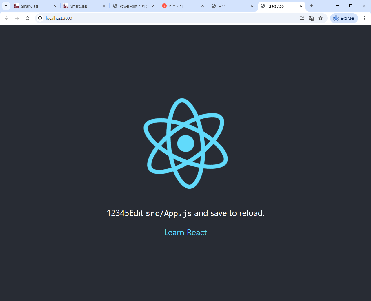 App.js 파일에서 변경하고 저장하면 새로고침하지 않아도 화면이 바뀌어있는 것을 알 수 있다.